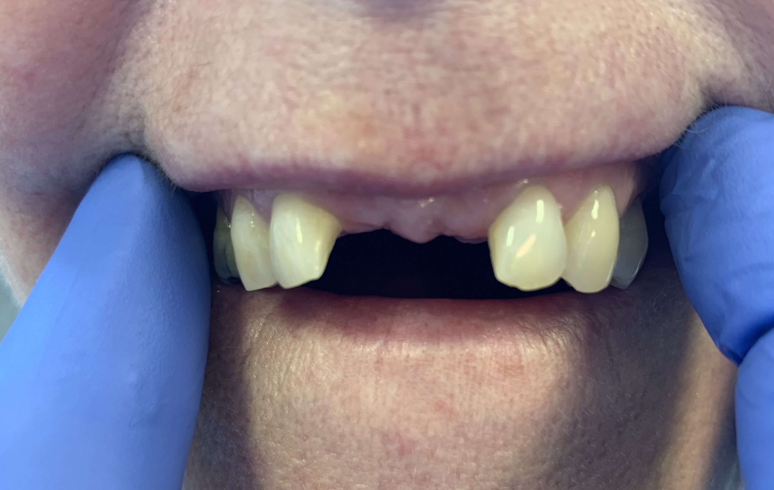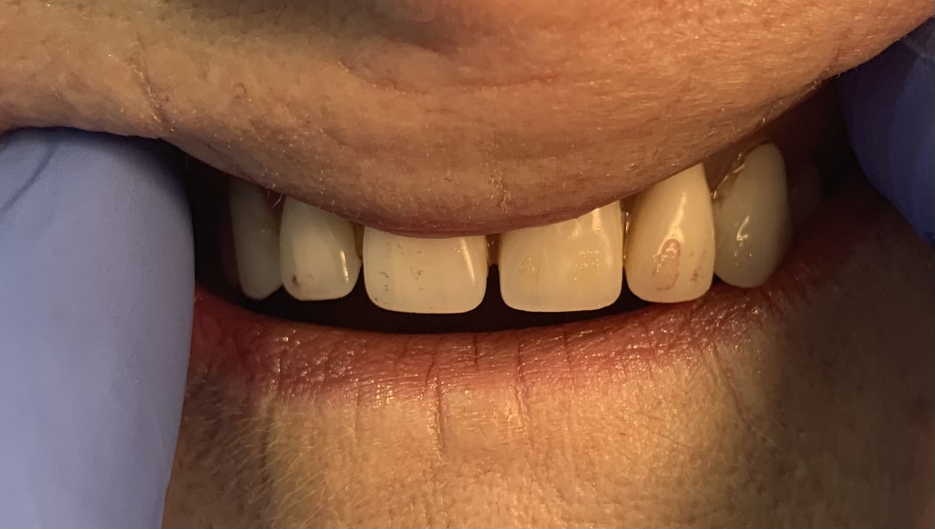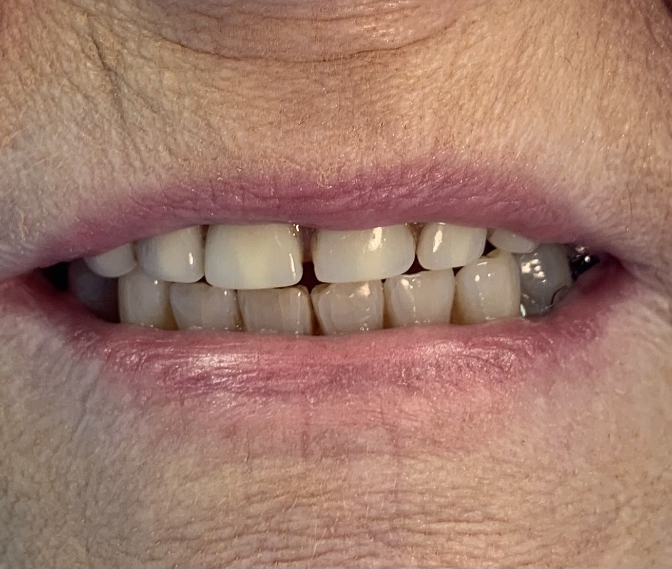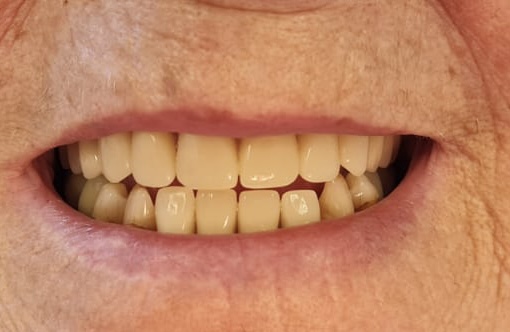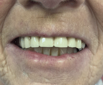 Patient disliked gaps in full upper which she had worn for many years. Complete rehabilitated with enigma denture-no comparison.
