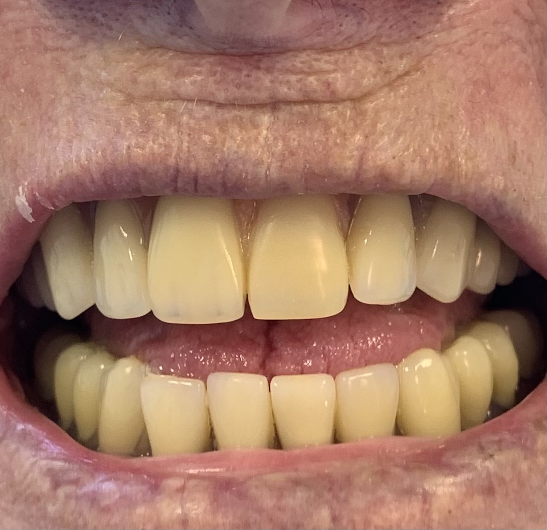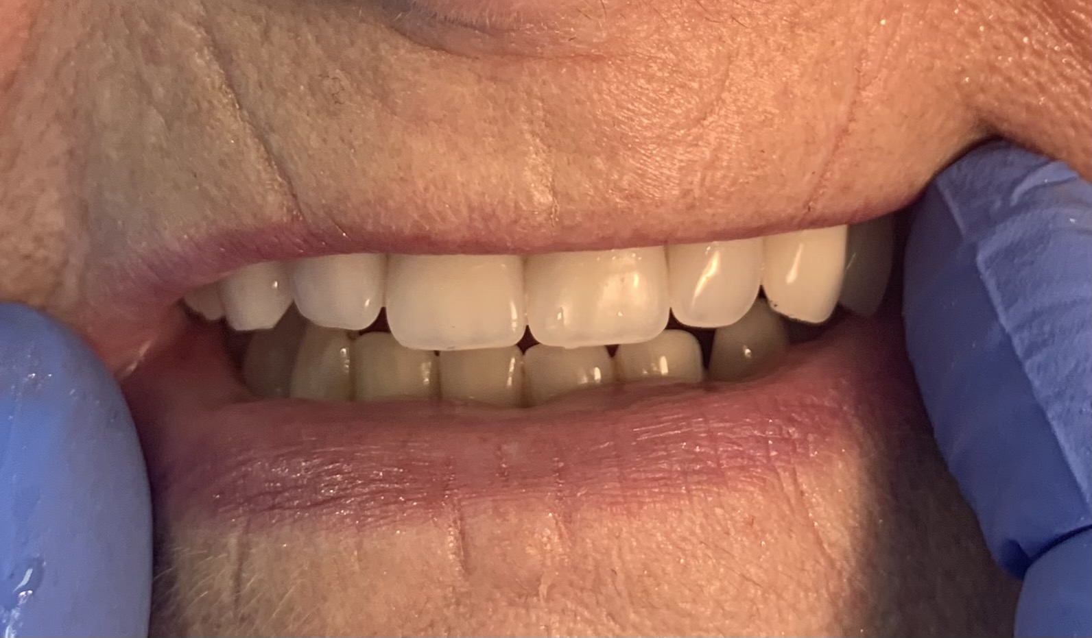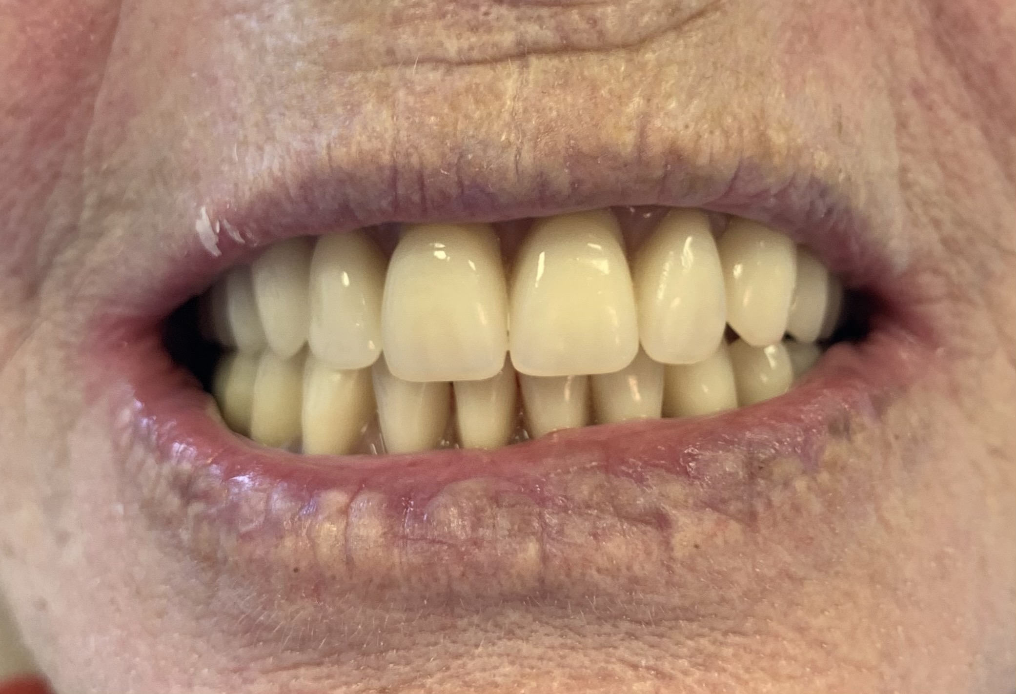 Patient disliked “ big false looking teeth “ .. replaced with enigma cosmetic natural looking upper and lowers on implants ... now she “ can’t stop smiling “.