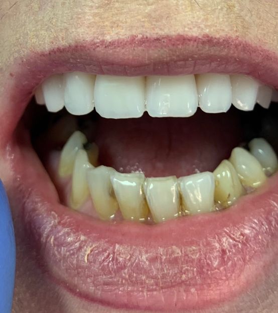 This lovely lady was horrified with dentures she received elsewhere. Technically and clinically terrible and she could not wear the lower ... we replaced partial upper and lower .. now she’s smiling again .